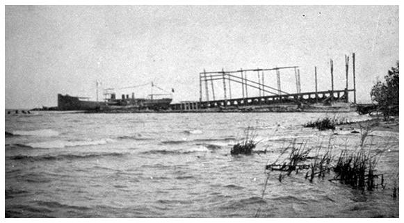 Le fond rocheux ne permettant pas le battage des pieux, il fallut créer un remblai artificiel en sable et pierres pour donner une fiche aux pilots.