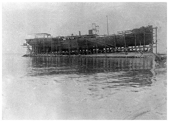 Le 23 août, l'arbre de tribord est en place, le berceau terminé, l'avant cale construite et la coque prête au lancement.
